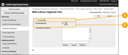 Om MAC-adressen har angetts felaktigt kan det hända att du inte kan komma åt maskinen via fjärranvändargränssnittet. I så fall måste du ställa in <Använd filter> på <Av> för <Utgående filter>/<Inkommande filter> i <MAC-adressfiltrering> på kontrollpanelen.