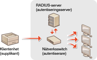I en nätverksmiljö som använder IEEE 802.1X-autentisering, blockeras obehörig nätverksåtkomst av en LAN-omkopplare (autentiserare) som bara ger åtkomstbehörighet för klientenheter (supplikanter) som är godkända av autentiseringsservern (RADIUS-servern). Om du vill ansluta enheten till ett IEEE 802.1X-nätverk måste inställningar, som vilken autentiseringsmetod som används av autentiseringsservern, ställas in på maskinen. Administratör behörighet krävs för att konfigurera dessa inställningar.[IEEE 802.1X-inställningar] existerar för såväl huvudlinjen som underlinjen. Registrera de inställningar som behövs.