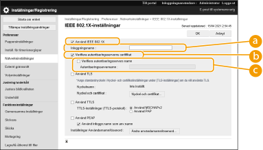 [Verifiera autentiseringsservers namn]Om du vill verifiera det gemensamma namnet i servercertifikatet, välj den här kryssrutan och skriv namnet på autentiseringsservern som har registrerats av den inloggade användaren i [Autentiseringsservernamn].