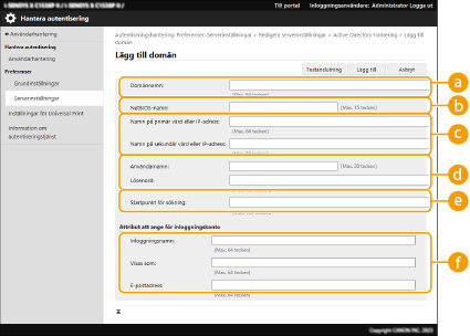 4 | Ange nödvändig information. ![]() [Domännamn:]Skriv domännamnet i Active Directory som är inloggningsdestination (Exempel: företag.domän.com). [NetBIOS-namn]Ange NetBIOS-domännamn (Exempel: företag). [Namn på primär värd:] / [Namn på sekundär värd:]Ange värdnamnet för Active Directory-servern eller IPv4-adressen. Om du använder en sekundär server, ange namnet i [Namn på sekundär värd:]. Exempel: Använda ett värdnamn: ad-server1 Använda en IPv4-adress: 192.168.18.138 [Användarnamn:] / [Lösenord:]Ange det användarnamn och lösenord som används för åtkomst till och sökning i Active Directory-servern. [Startpunkt för sökning:]Ange vilken plats på Active Directory-servern du vill komma åt och söka på. [Inloggningsnamn:] / [Visas som] / [E-postadress:]Ange datafält (attributnamn) för inloggningsnamn, visningsnamn och e-postadress för varje användarkonto på Active Directory-servern (Exempel: sAMkontonamn, cn, e-post). |