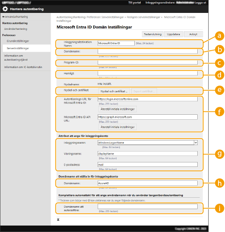 2 | Ange nödvändig information. ![]() [Inloggningsdestination Namn:]Ange visningsnamnet för inloggningsdestinationen. Standardvärde: Microsoft Entra ID [Domännamn:]Ange det domännamn för Microsoft Entra ID som är inloggningsdestinationen. [Program-ID:]Ange program-ID (klient). [Hemligt:]Ange hemligheten som verkställts i Microsoft Entra ID. När du använder [Nyckel och certifikat ] behöver du inte ange det här. [Nyckel och certifikat ]Klicka på [Nyckel och certifikat ] när du använder en nyckel och ett certifikat. Genom att klicka på [Export certifikat ] kan du exportera det certifikat som är registrerat till Microsoft Entra ID. [Autentiserings-URL för Microsoft Entra ID] / [Microsoft Entra ID API URL] Ange URL:en. Beroende på din molnmiljö kan det vara nödvändigt att ändra URL:en. Klicka på [Återställ initiala inställningar] för att återställa URL:en för [Autentiserings-URL för Microsoft Entra ID] / [Microsoft Entra ID API URL] till standardvärdet. Standardvärde: [Autentiserings-URL för Microsoft Entra ID]: https://login.microsoftonline.com [Microsoft Entra ID API URL]: https://graph.microsoft.com [Inloggningsnamn:] / [Visningsnamn:] / [E-postadress:] Ange datafältsnamnen (attribut) som ett inloggningsnamn, visningsnamn och en e-postadress för varje användarkonto är registrerat för på en Microsoft Entra ID-server. Standardvärde: WindowsLogonName, displayName, mail Exempel: userPrincipalName, displayName, mail [Domännamn:] Under de flesta omständigheter behöver du inte ändra inställningen. Standardvärde: AzureAD [Domännamn att autoslutföra:] Ange domännamnet som anges automatiskt. Du behöver inte ange domännamnet efter @ själv. |
