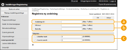 Hantering av avdelnings-ID gäller bara för användare som har registrerats på den lokala enheten. Om du loggar in som en användare med administratörsbehörighet tilldelas automatiskt systemansvarig-ID och PIN-kod och de hanteras som avdelnings-ID. |