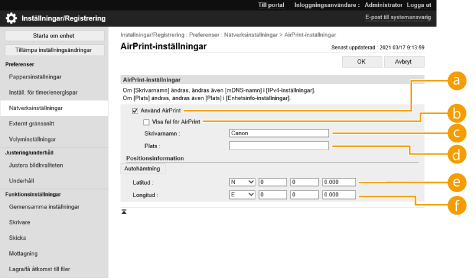 Om du loggar in med administratörsbehörighet kan du även ändra AirPrint-inställningarna från sidan för AirPrint.