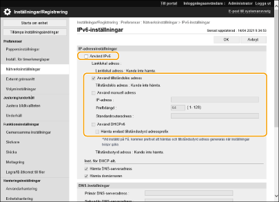 Välj [Använd IPv6] och konfigurera nödvändiga inställningar.