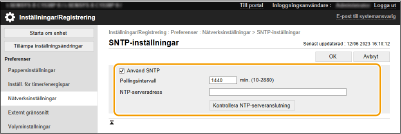 SNTP (Simple Network Time Protocol) gör det möjligt att justera systemklockan genom att använda tidsservern i nätverket. Om SNTP används, kontrolleras tidsservern vid de angivna intervallen, och därför kan korrekt tid alltid bibehållas. SNTP-inställningarna kan anges via fjärranvändargränssnittet.