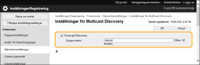 Markera kryssrutan om du vill ställa in maskinen så att den svarar på enhetshanteringsprogrammets multicast discovery-paket och aktivera övervakning med enhetshanteringsprogrammet.