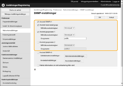 SNMP (Simple Network Management Protocol) är ett protokoll för att övervaka och styra kommunikationsenheter i ett nätverk genom att använda MIB (Management Information Base). Maskinen stöder SNMPv1 och säkerhetsutökad SNMPv3. Du kan kontrollera maskinens status från en dator när du skriver ut dokument eller använder Fjärranvändargränssnittet. Du kan aktivera antingen SNMPv1 eller SNMPv3 eller båda samtidigt. Ange inställningarna för varje version som passar din nätverksmiljö och ändamålet med användningen.