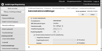 1 | Klicka på [Administratörsinställningar]. [Använd administratör] Markera kryssrutan för att använda användaren Administratör. [Autentiseringsalgoritm] och [Krypteringsalgoritm] kan inte ändras. [Använd samma lösenord som för autentisering] Markera kryssrutan för att använda samma lösenord som lösenordet som användes vid användarautentisering. |