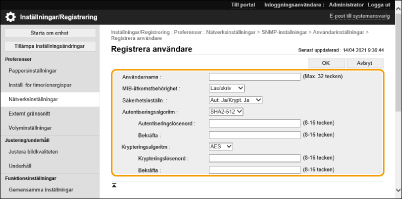 3 | Klicka på [Användarinställningar]  [Registrera]. [Användarnamn] Ange alfanumeriska tecken för användarnamnet. [MIB-åtkomstbehörighet] Välj [Läs/skriv] eller [Skrivskydd] för åtkomstbehörighet till MIB-objekt. [Läs/skriv] | Tillåter både visning och ändring av värdena för MIB-objekt. | [Skrivskydd] | Tillåter endast visning av värdena för MIB-objekt. |