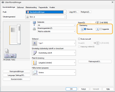 2 | På skärmen [Grundinställningar] i drivrutinen ställer du in samma [Orientering] som i steg 1. |
