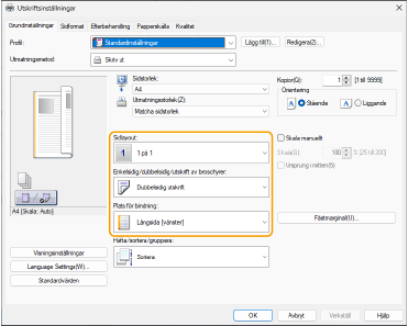 3 | I förhandsgranskningen ställer du in [Sidlayout] [Sidordning] [Enkelsidig/dubbelsidig/utskrift av broschyrer] [Plats för bindning]. |
