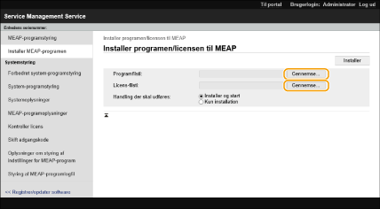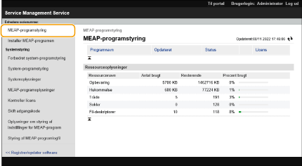 Du kan tjekke antallet af installerede applikationer og den lagerenhedsplads der anvendes. Administration af MEAP-applikationer Hvis din MEAP-applikation ikke leveres med et licensadgangsnummer, får du din licensfil fra din MEAP-applikationsleverandør. Licensnøglen og licensfilen, som beskrevet i dette afsnit, er ikke nødvendige. Der er flere informationer i håndbogen, der følger med den enkelte MEAP-applikation. Afhængigt af MEAP-applikationen kan den kræve en særlig betingelse for at kunne installeres. For flere informationer kan du se brugervejledningen til den MEAP-applikation, der skal anvendes. Det maksimale antal MEAP-applikationer, der kan installeres på denne maskine, er 20. |