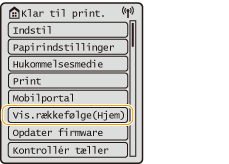 Vælg <Indstil> for at få vist skærmen <Menu>. Mange af maskinens indstillinger, såsom administrationsindstillinger, skærmindstillinger og netværksindstillinger, konfigureres ved at vælge <Indstil> først.