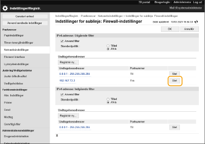 Det er kun IPv4-adresser, der kan registreres for underlinjen. Få oplysninger om undtagelsesadresser og undtagelsesportnumre, der kan bruges til kommunikation og registreres som standard, under Administrationsfunktioner. |