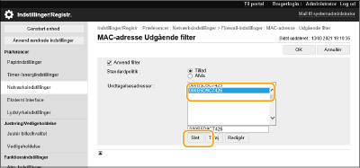 Hvis MAC-adressen indtastes forkert, er du muligvis ikke i stand til at tilgå maskinen fra brugergrænsefladen til fjernbetjening. I så fald skal du indstille <Anvend filter> til <Fra> for <Udgående filter>/<Indgående filter> i <MAC-adressefilter> på betjeningspanelet.