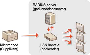 Hvis en enhed forsøger at oprette forbindelse til og begynder at kommunikere på et 802.1X-netværk, skal enheden igennem brugergodkendelse for at bevise, at forbindelsen oprettes af en autoriseret bruger. Godkendelsesoplysningerne sendes til og kontrolleres af en RADIUS-server, der tillader eller afviser kommunikation til netværket afhængigt af godkendelsesresultatet. Hvis godkendelsen mislykkes, blokerer en LAN-switch (eller et adgangspunkt) adgangen fra den udvendige side af netværket. Maskinen kan oprette forbindelse til et 802.1X-netværk som en klientenhed. Konfiguration af IEEE 802.1X-godkendelsesindstillingerne