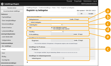 [Mål]Du kan enten indstille en værdi, der angives af betjeningsmålet, eller en værdi, der ikke er angivet. [Handling]Vælg, hvordan du vil håndtere dokumenter, der opfylder betingelserne. Når [Hold som Delt job] er valgt, kan du indstille [ID til udskiftning] til at angive det brugernavn, der skrives i loggen, når der printes. Vælg [Annullér] for at kassere dokumentet. | ||||||