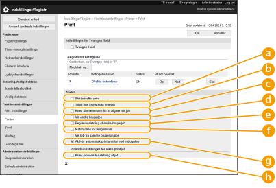 Konfiguration af detaljerede indstillinger for tvunget stop i printningDu kan konfigurere detaljerede indstillinger for dokumenter, der holdes til printning, som f.eks. hvor længe de skal gemmes, og hvordan de skal vises. <Print> Import/eksport af batchDenne indstilling kan importeres/eksporteres med modeller, der understøtter batchimport af denne indstilling. Import/eksport af indstillingsdataene Denne indstilling findes i [Grundlæggende oplysninger om indstillinger/registrering] ved batcheksport. Import/eksport af alle indstillinger |