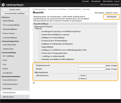 Indtast adgangskoden i [Krypteret password] vælg sikkerhedsniveau i [Sikkerhedsniveau]  klik på [Start eksport]  [OK].