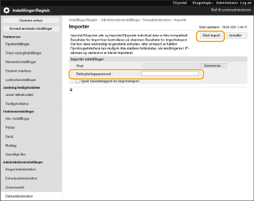Passwordet i [Krypteret password] er påkrævet ved import af de eksporterede indstillingsdata. Brug alfanumeriske tegn.