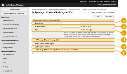 Du kan indstille et link til hjemmesiden for køb af forbrugsstoffer, der vises ved kontrol af oplysninger om forbrugsstoffer fra Remote UI (brugergrænseflade for fjernbetjening). Indstilling af et link til hjemmesiden gør det nemmere for brugere at købe forbrugsstoffer.