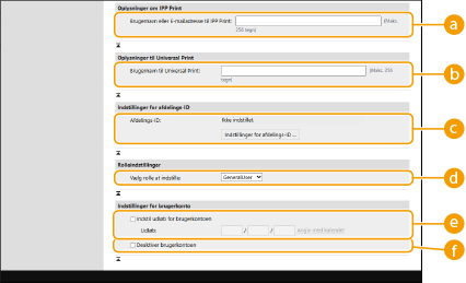 Tjek for ikke-registrerede afdelings-ID'erHvis du klikker på [Kontrollér uregistreret afdelings-ID ...] på skærmbilledet, der vises i trin 4, kan du finde de afdelings-ID'er, der ikke er registreret i maskinen ved at tjekke afdelings-ID'er, der er knyttet til brugere, i forhold til de afdelings-ID'er, der er registreret i maskinen. Batchindstillinger for afdelings-id'erHvis du klikker på [Batchindstillinger for afdelings-ID ...] på skærmen, der vises i trin 4, kan du oprette nye afdelings-id'er og anvende indstillinger for alle brugere. Hvis brugernavnet består af tal og er på 7 cifre eller færre, tildeles det samme tal til den samme bruger som afdelings-id'et. Hvis den samme brugers password er registreret som et tal på 7 cifre eller færre, indstilles det også som PIN-koden for det afdelings-id. Hvis brugernavnet og passwordet ikke opfylder ovenstående betingelser, tildeles der automatisk et afdelings-id startende fra 0000001, og 0 (ingen) indstilles for PIN-koden. Registrering af afdelings-id'et som brugernavnetHvis du klikker på [Tilføj bruger via afdelings-ID ...] på skærmbilledet i trin 4, registreres der en ny bruger med samme navn som afdelings-id'et. Når tastaturgodkendelse bruges, kan godkendelse kun ske med indtastning med taltaster. |