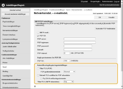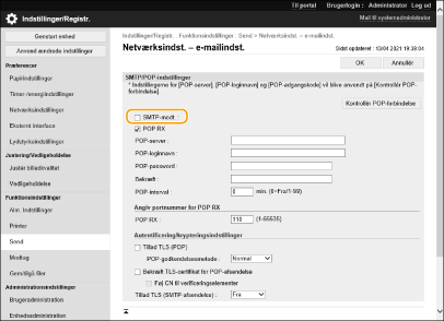 Dette afsnit beskriver angivelse af indstillinger for modtagelse og udskrivning af E-mail på denne maskine. Anvend en computer til at angive indstillinger for modtagelse af E-mails og kontrolpanelet på maskinen til at angive indstillinger for udskrivning af E-mails. Administratorrettigheder er påkrævet for at kunne konfigurere disse indstillinger.