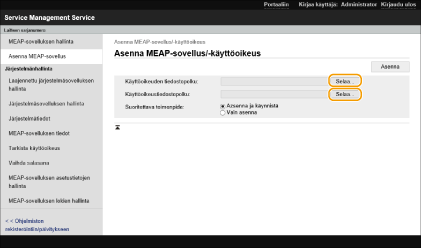Riippuen MEAP-sovelluksesta, käyttöopas tai vastaava ohjelma voidaan ladata seuraavasta URL:stä. http://canon.com/fau/downloads. Voit päivittää MEAP-sovelluksen version samalla tavalla kuin asennuksen. Lopeta MEAP-sovellus SMS-näytössä ennen asennusta. MEAP-sovellusten hallinta Sovellusten käyttämän tallennuslaitteen enimmäismäärä on noin 1 434 Mt. Jos laite on suorittamassa sammutusprosessia, kun sovellusta asennetaan, SMS:n asennussivulla voi näkyä virheilmoitus ja asennus saatetaan peruuttaa. Yritä tässä tapauksessa asentaa MEAP-sovellus uudelleen, kun olet käynnistänyt laitteen uudelleen (katkaise virta pääkytkimestä ja kytke se sitten takaisin päälle). Ohjeita laitteen virran katkaisusta/kytkemisestä on kohdissa Laitteen virran katkaiseminen, Laitteen käynnistäminen. |