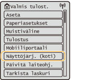 (Koti) -kuvaketta painetaan. <Päävalikko>-näkymä tai asetusnäkymä ilmestyy näytölle, jolloin voit aloittaa toimintoja, kuten <Muistiväline> ja <Mobiiliportaali>. Voit käyttää näyttöä myös virheilmoitusten ja laitteen toimintatilan kaltaisten tietojen tarkistamiseen.