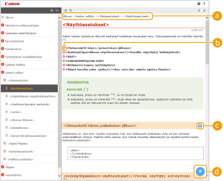 Määritä Käyttöopas -oppaan asetukset, kuten tekstin koko, asettelu ja näyttötapa, napsauttamalla.