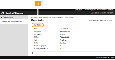 Sisäänkirjautuminen pääkäyttäjänä vaaditaan mukautettujen paperityyppien tallentamiseen tai tallennettujen mukautettujen paperityyppien asetusten muuttamiseen. Laitteeseen kirjautuminen Kun tallennat muokatun paperityypin, et voi määrittää paperilähdettä. Lisätietoja paperilähteen tallentamisesta on kohdassa Paperikasetin paperikoon ja -tyypin määrittäminen. Voit tuoda/viedä tallennetut muokatun paperin tyyppitiedot ja jakaa ne toisen Canon-laitteen kanssa. Kaikkien asetusten tuonti/vienti |