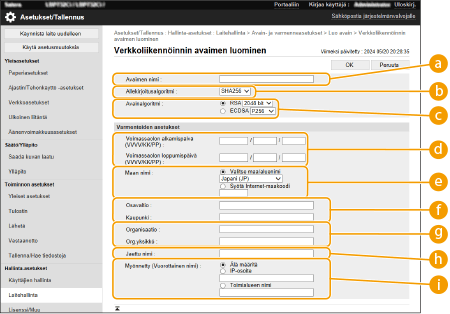 [Avainalgoritmi]Valitse avaimen luontialgoritmiksi [RSA] tai [ECDSA]. Valitse avaimen pituus, jos valitsit vaihtoehdon [RSA], ja avaimen tyyppi, jos valitsit vaihtoehdon [ECDSA]. Molemmissa tapauksissa suuremman arvon valitseminen parantaa turvallisuutta, mutta vähentää tiedonkäsittelynopeutta.