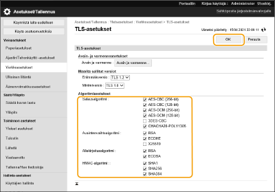 Seuraavat TLS-version ja algoritmin yhdistelmät ovat käytettävissä.