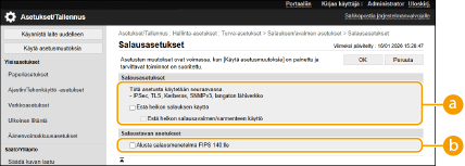 Jos valitset [Alusta salausmenetelmä FIPS 140:lle], voit muokata TLS-tietoliikenteen salausmenetelmän Yhdysvaltain hallituksen hyväksymän FIPS (liittovaltion tietojenkäsittelystandardit) 140 -standardin mukaiseksi, mutta seuraavat rajoitukset pätevät.