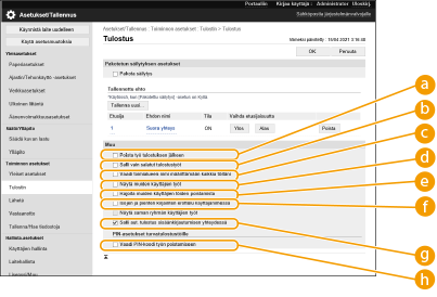 Voit koostaa asetukset asiakirjoille jotka ovat pidossa tulostukseen, kuten miten pitkään niitä säilytetään ja miten ne näytetään. <Tulostus>