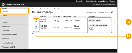 Voit tarkistaa tulostusta odottavien asiakirjojen tilanteen. Voit myös tulostaa asiakirjan ennen muita, tai peruuttaa asiakirjan.