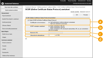 Valitse [Käytä OCSP:tä (Online Certificate Status Protocol)] -valintaruutu ja määritä online-varmenteiden tilaprotokolla (OCSP).