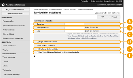 Voit asettaa verkkosivustolinkin kulutustarvikkeiden hankkimista varten, joka näkyy, kun kulutustarvikkeiden tietoja tarkistetaan etäkäyttöliittymästä käsin. Linkin asettaminen verkkosivustolle helpottaa kulutustarvikkeiden hankintaa käyttäjien kannalta.