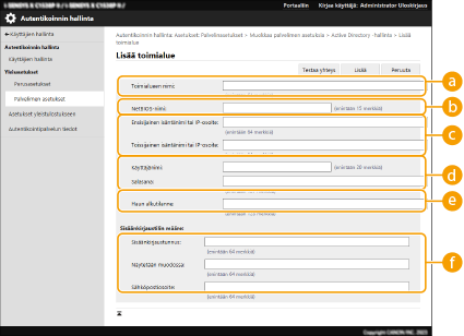 4 | Syötä tarvittavat tiedot. ![]() [Toimialueen nimi:]Lisää kirjautumiskohteena olevan Active Directoryn toimialueen nimi (esimerkki: company.domain.com). [NetBIOS-nimi]Kirjoita NetBIOS-toimialueen nimi (esimerkki: company). [Ensisijainen isäntänimi:] / [Toissijainen isäntänimi:]Kirjoita Active Directory -palvelimen isäntänimi tai IPv4-osoite. Toissijaista palvelinta käytettäessä nimi määritetään kohtaan [Toissijainen isäntänimi:]. Esimerkki: Isäntänimen käyttö: ad-server1 IPv4-osoitteen käyttö: 192.168.18.138 [Käyttäjänimi:] / [Salasana:]Syötä käyttäjänimi ja salasana joita käytetään haettaessa Active Directory -palvelinta. [Haun alkutilanne:]Määritä Active Directory -palvelimen käytön ja haun sijainti. [Sisäänkirjaustunnus:] / [Näytetään muodossa] / [Sähköpostiosoite:]Määritä kirjautumisnimen tietokentät (määreiden nimet), näyttönimi ja kunkin Active Directory -palvelimen käyttäjätilin sähköpostiosoite (esimerkki: sAMAccountName, cn, mail). |