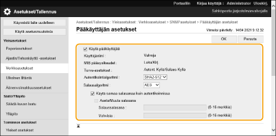 1 | Valitse [Pääkäyttäjän asetukset]. [Käytä pääkäyttäjää] Rastita valintaruutu, jotta voit käyttää pääkäyttäjä-statusta. [Autentikointialgoritmi]- ja [Salausalgoritmi] -asetuksia ei voi muuttaa. [Käytä samaa salasanaa kuin autentikoinnissa] Rastita valintaruutu, jotta voit käyttää samaa salasanaa kuin mitä käytät käyttäjätodennuksessa. |