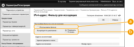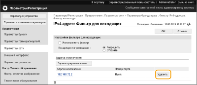 Если IP-адрес введен неправильно, возможно, вы не сможете получить доступ к устройству Remote UI (Удаленный ИП). В этом случае установите <Использовать фильтр>, чтобы <Выкл.> для <Фильтр на выходе>/<Фильтр на входе> в разделе <Фильтр IPv4-адресов> или <Фильтр IPv6-адресов> — с панели управления.