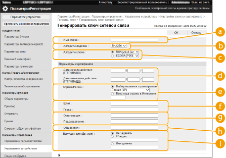 [Алгоритм ключа]Выберите [RSA] или [ECDSA] в качестве алгоритма генерации ключа. Выберите длину ключа, если вы выбрали [RSA], и тип ключа, если вы выбрали [ECDSA]. В обоих случаях задание более высокого значения позволяет повысить безопасность, однако скорость передачи данных при этом снижается.