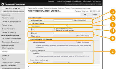 2 | Задайте условия отложенной печати документов и щелкните [OK]. ![]() [Название условия]Введите название условия. Укажите название, которое в дальнейшем можно будет с легкостью найти в списке. [Включить условие]Установите этот флажок, чтобы включить условие. [Услов. задания]Выберите необходимые типы условий, которые перечислены в таблице ниже.
