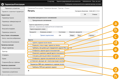 Выберите исключения из ограничения![]() | При печати документов с компьютера можно откладывать печать данных в аппарате, а не печатать документы немедленно (Печать документов, принудительно отложенных в памяти аппарата). Можно настроить параметры так, чтобы печать таких документов выполнялась только после авторизации пользователя на аппарате. Это позволяет повысить уровень защиты и снизить риск просмотра или непреднамеренного изъятия из аппарата конфиденциальных документов посторонними лицами. Для их настройки требуются полномочия администратора. |