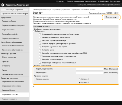 Чтобы зашифровать все данные настроек, выберите [Уровень 2] в [Уровень защиты].
