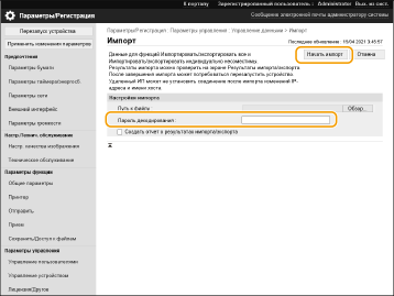 Проверьте сведения об администраторе системыПри импорте параметров управления ИД отдела на другой принтер/многофункциональный аппарат, на котором включена функция управления ИД отдела, сведения об администраторе системы перезаписываются, в результате чего вход в систему с использованием учетных данных и PIN-кода предыдущего системного администратора будет невозможен. Прежде чем выполнять эту операцию, проверьте сведения об администраторе системы, сохраненные на аппарате, с которого экспортируются параметры. |