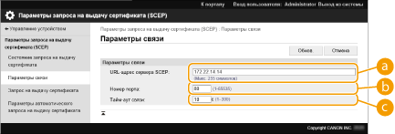 [Тайм-аут связи:]Введите тайм-аут, используемый при обмене данными с сервером SCEP. Подключение будет отменено, если в течение заданного интервала не будет получено ответа от сервера SCEP.