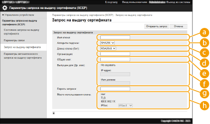 Запрос на выдачу сертификата, требуемого для ключей, сгенерированных на аппарате, может быть отправлен на сервер SCEP (Simple Certificate Enrollment Protocol, простой протокол регистрации сертификатов), который управляет сертификатами. Сертификаты, выданные сервером SCEP, автоматически регистрируются на аппарате. Для отправки запроса на выдачу сертификатов требуются привилегии Administrator.