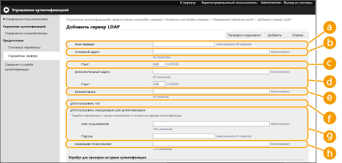 3 | Укажите сведения о сервере LDAP. ![]() [Имя сервера]Введите имя сервера LDAP. Укажите имя, отличное от localhost и без пробелов. [Основной адрес]Введите IP-адрес или имя узла сервера LDAP (Пример: ldap.example.com). Не используйте петлевой адрес (127.0.0.1). [Порт:]Введите номер порта, используемого для обмена данными с сервером LDAP. Укажите то же значение, что и на сервере. Если оставить это поле пустым, то после установки флажка [Использовать TLS] автоматически будет указан порт «636», а если снять этот флажок, будет указан порт «389». [Дополнительный адрес:] / [Порт:]Если в рабочей среде используется дополнительный сервер, укажите его IP-адрес и номер порта. [Комментарии]Введите описание или примечание. [Использовать TLS]Установите этот флажок, если для связи с сервером LDAP используется протокол TLS с шифрованием данных. [Использовать информацию для аутентификации]Снимите этот флажок, чтобы разрешить анонимный доступ к серверу LDAP (только если сервер LDAP настроен на использование анонимного доступа). Если для аутентификации используются имя пользователя и пароль, установите этот флажок и введите соответствующие данные в полях [Имя пользователя:] и [Пароль:]. ![]() Если этот флажок установлен, при изменении настроек в [Основной адрес] или [Дополнительный адрес:] сервера LDAP потребуется ввести пароль, заданный в [Пароль:] в [Использовать информацию для аутентификации]. [Начальная точка поиска:]Укажите местоположение (уровень) для поиска сведений о пользователе во время аутентификации с помощью сервера LDAP. |