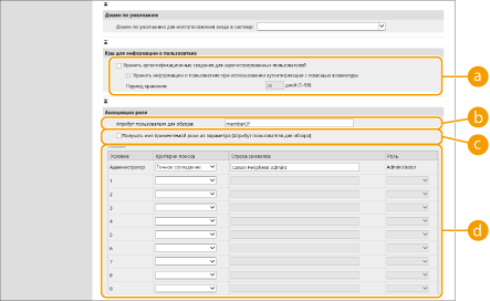 [Строка символов] | Введите строку символов, которая зарегистрирована для атрибута, указанного в раскрывающемся списке [Атрибут пользователя для обзора:]. Чтобы задать полномочия на основе группы, к которой принадлежит пользователь, введите имя такой группы. |